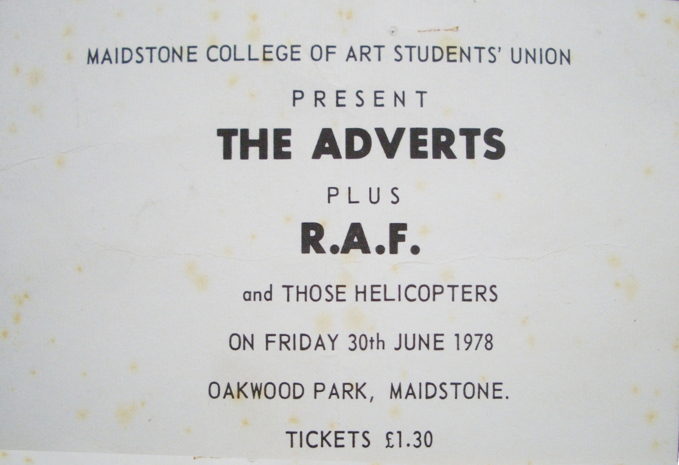 Above is an original Gig Ticket for "The Adverts", "R.A.F." & "Those Helecopters" at 'Maidstone College Of Art' on Friday 30th June 1978. |